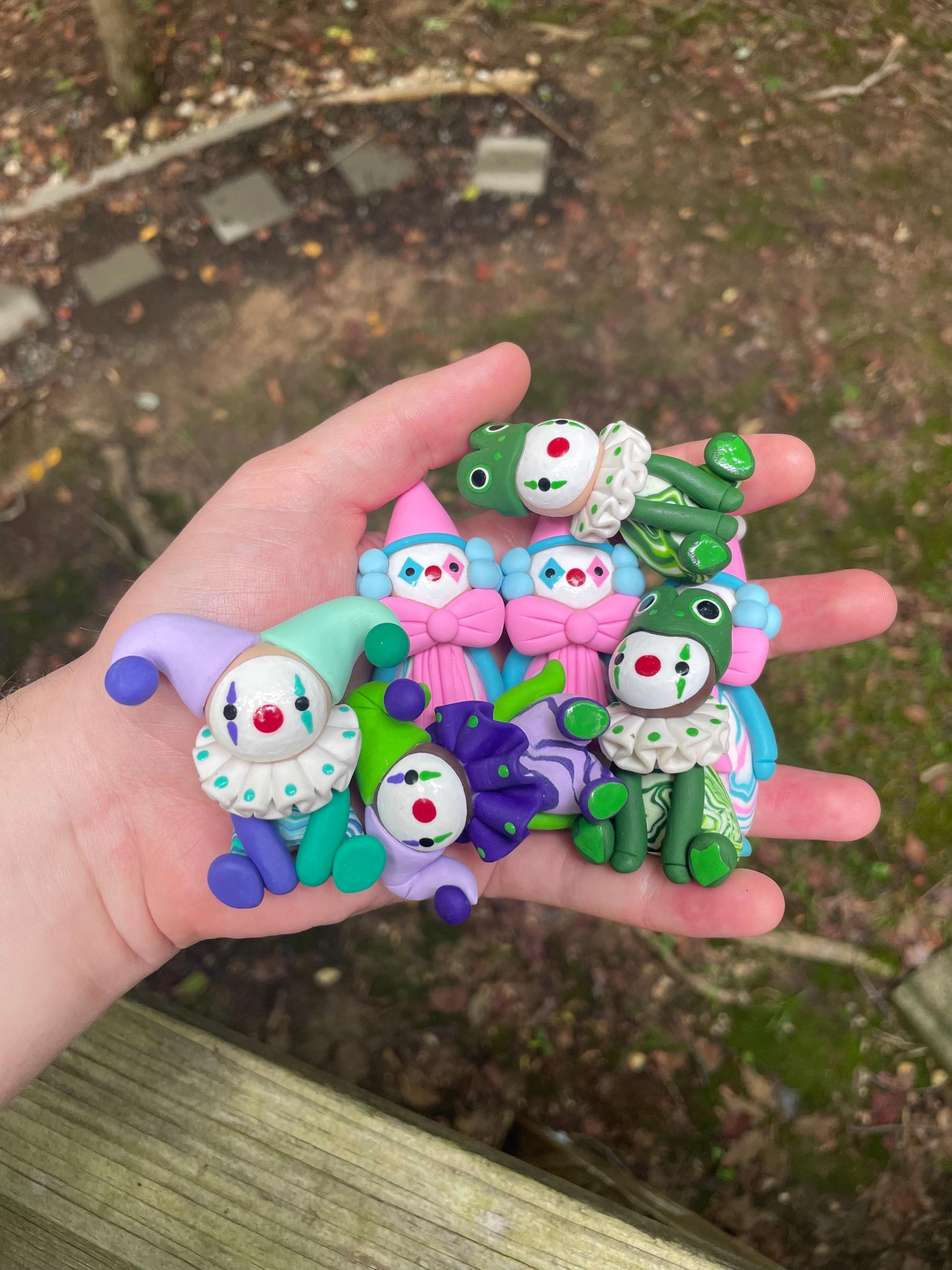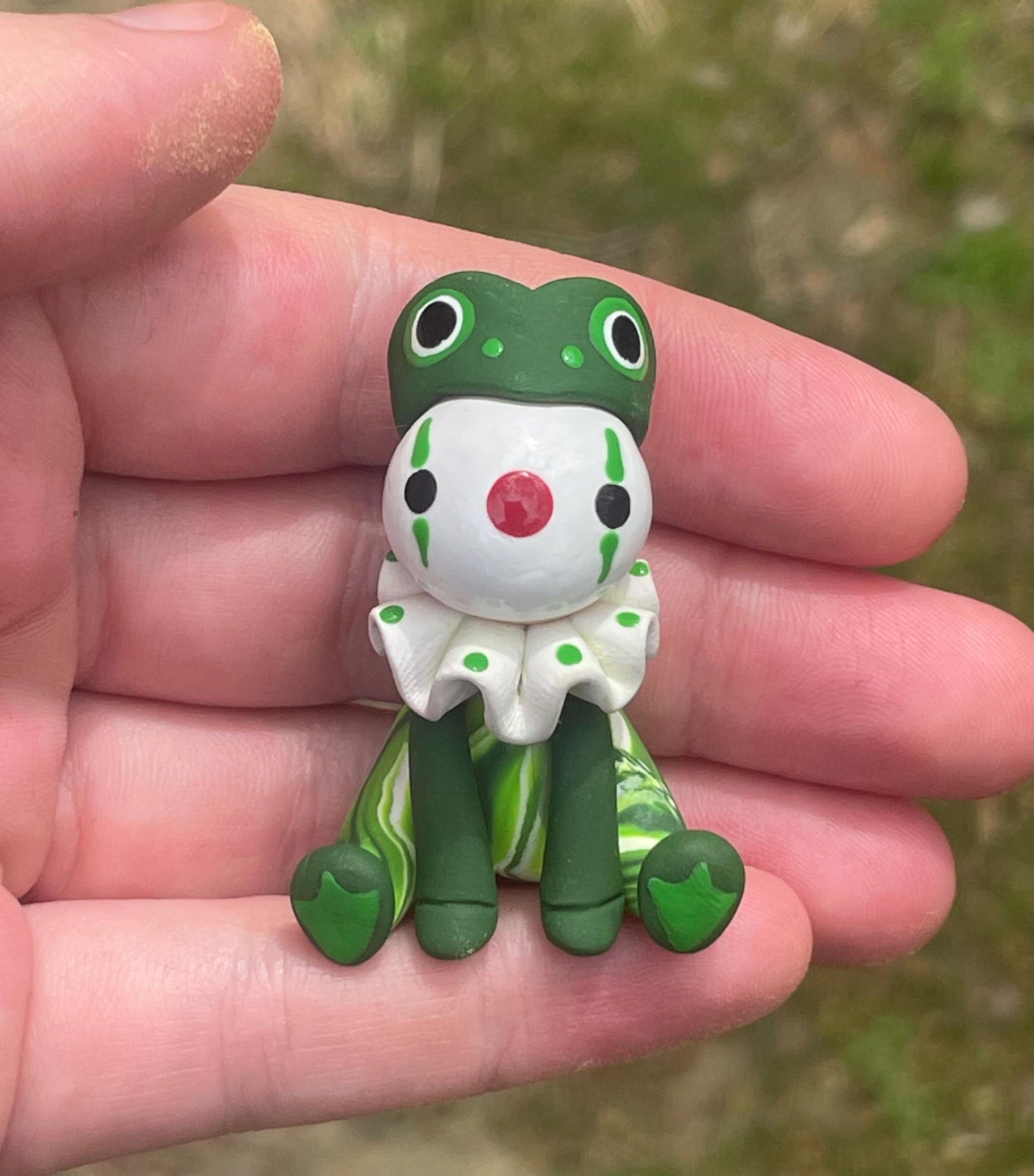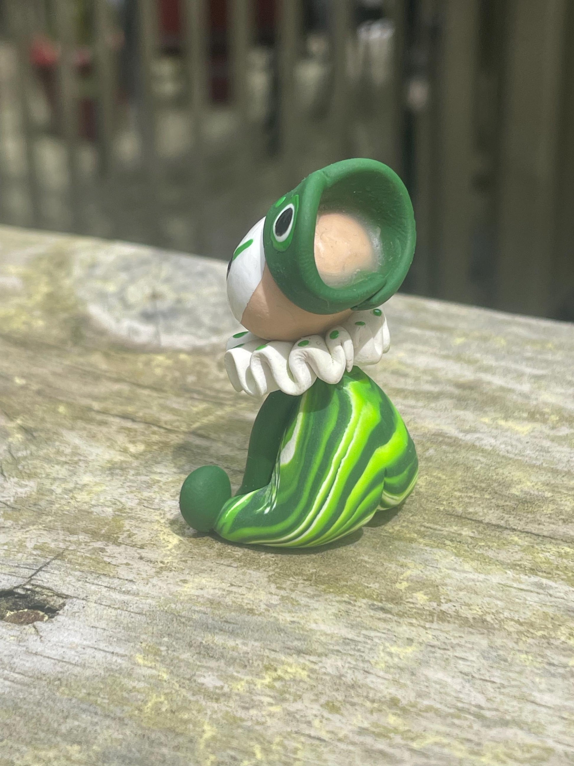 This is Frug! He is a frog themed clown figurine made from polymer clay. He has a white and green color scheme with a marbled jumpsuit, a white ruffle, and a frog crown. He is about 2.5 inches tall and 1.5 inches wide and looking for a home!