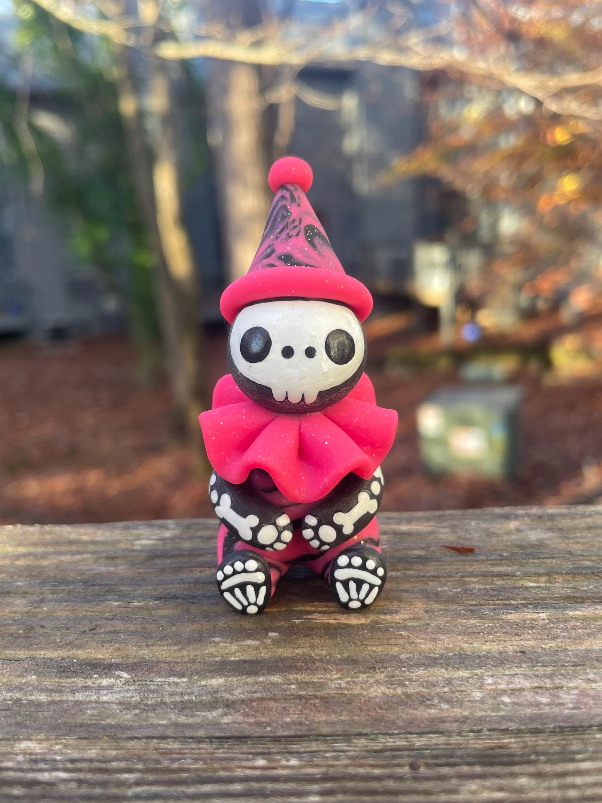 Skully-Bones the clown has a tie-dye pink and black color scheme, a pointy party hat, and hand painted bones! He is small, measuring in at only 3 inches in height. He is made from polymer clay and acrylic paint.