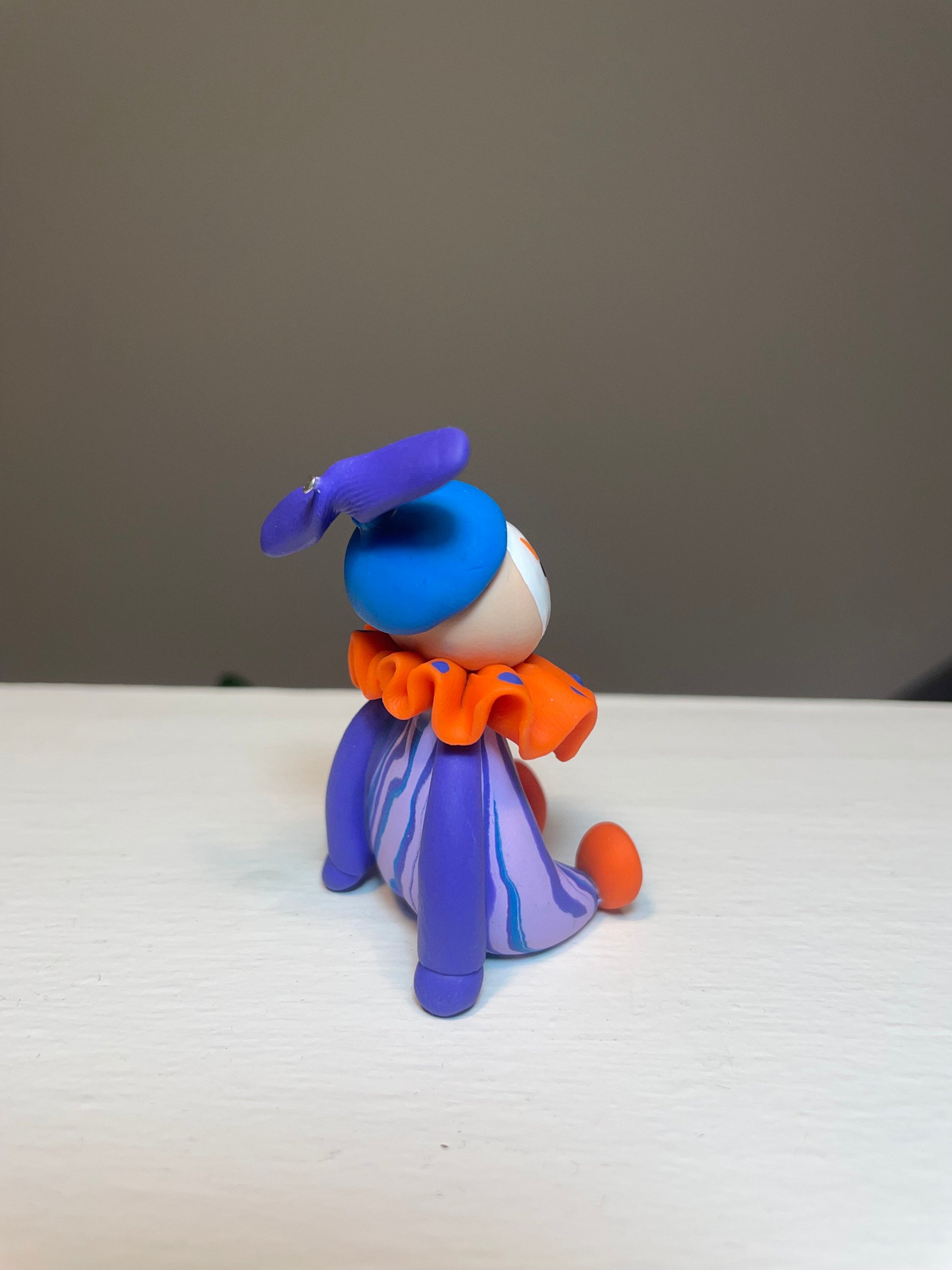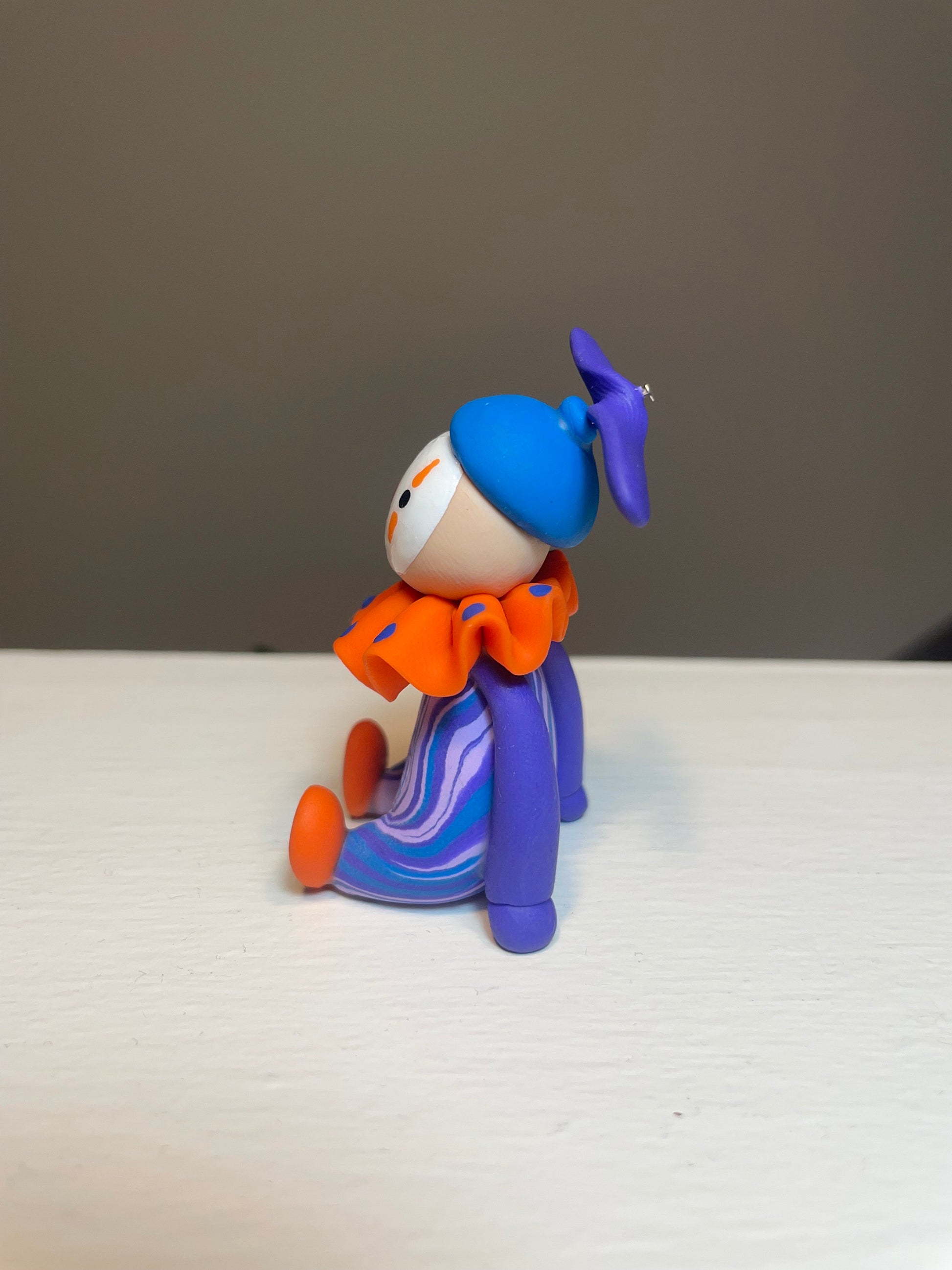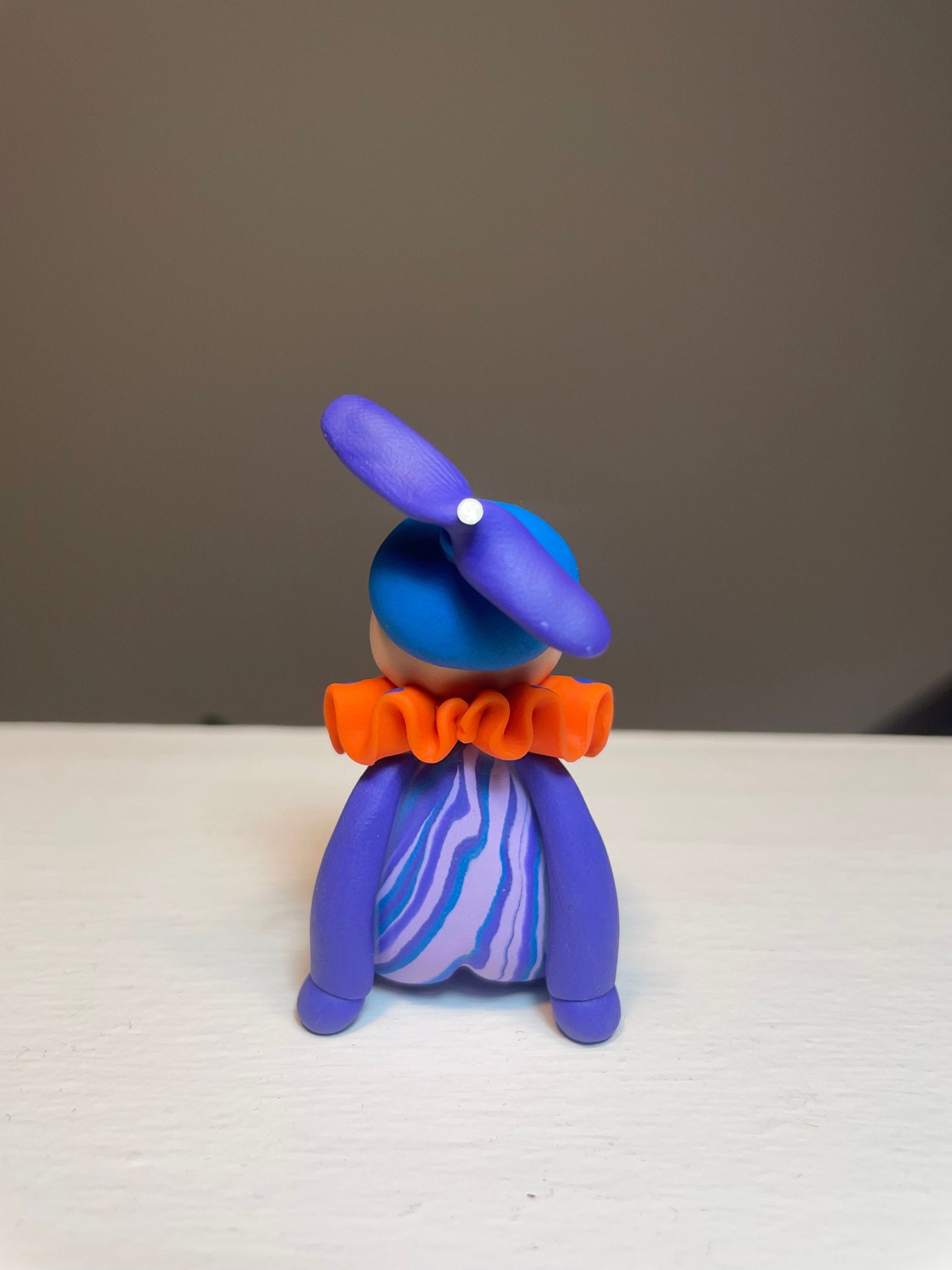 This is Whooper, our most aerodynamic clown! Whooper has a spinning propeller hat and a purple, blue, and orange color scheme. Whooper is 2.5 inches tall, 1.5 inches wide, and looking for a home!
