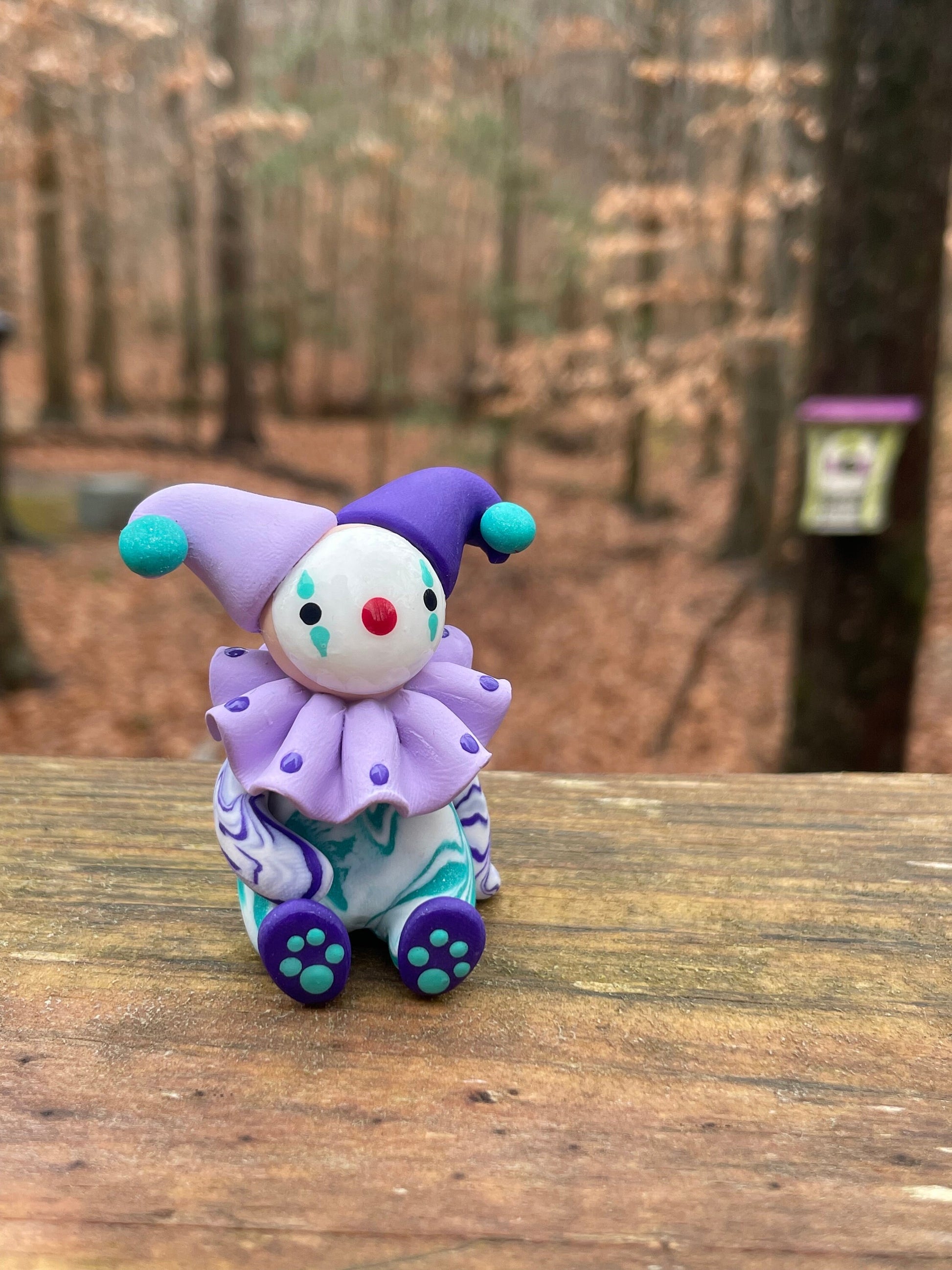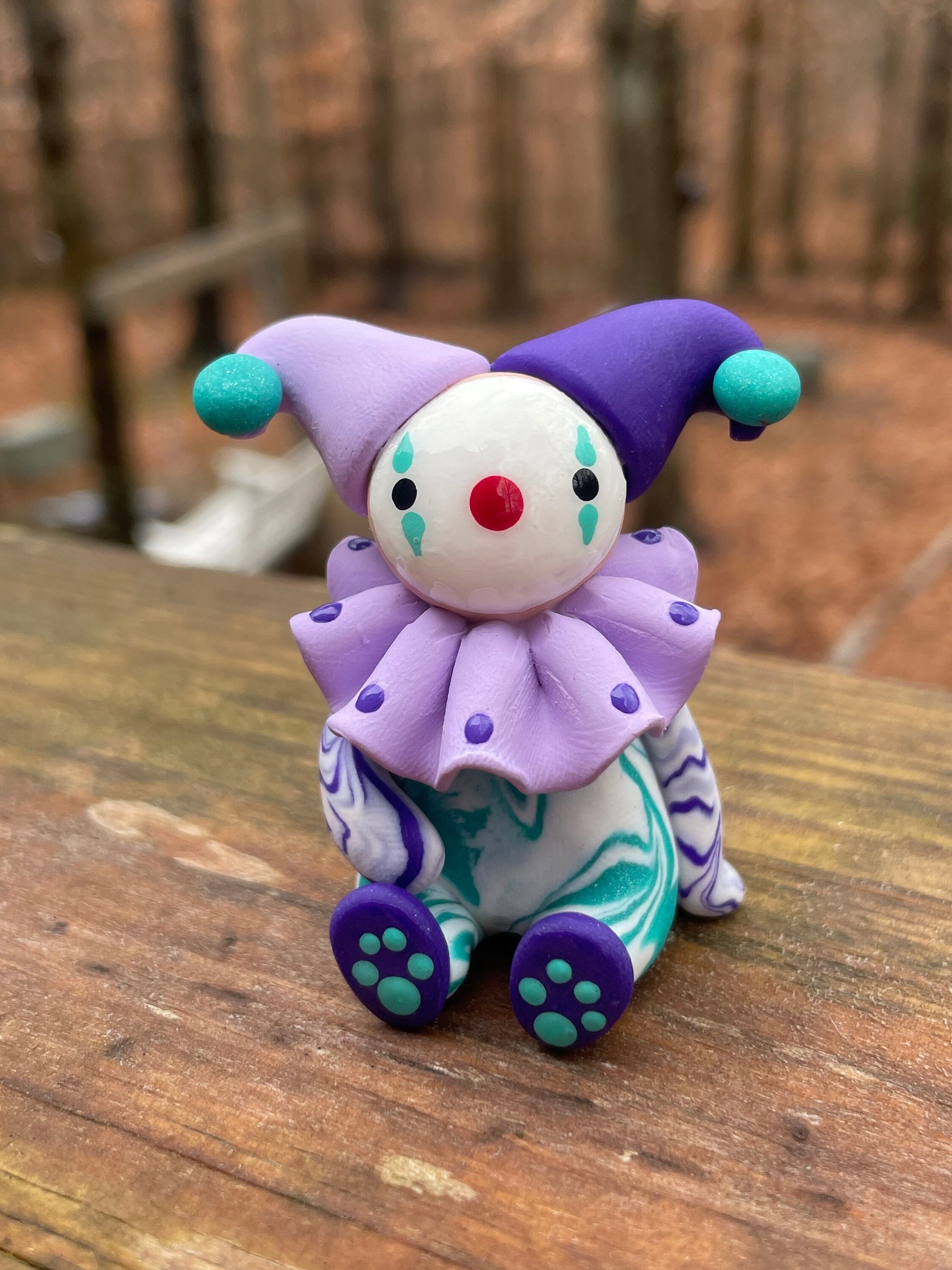 This is Wobbles, he's the very first clown design we've sculpted and he's looking for a home. He is made from polymer clay, has a marbled outfit, and is reinforced with an internal, wire armature. He has a small, purple rabbit tail on the back of his outfit, paw prints on his shoes, and is small enough to sit in the palm of your hand.