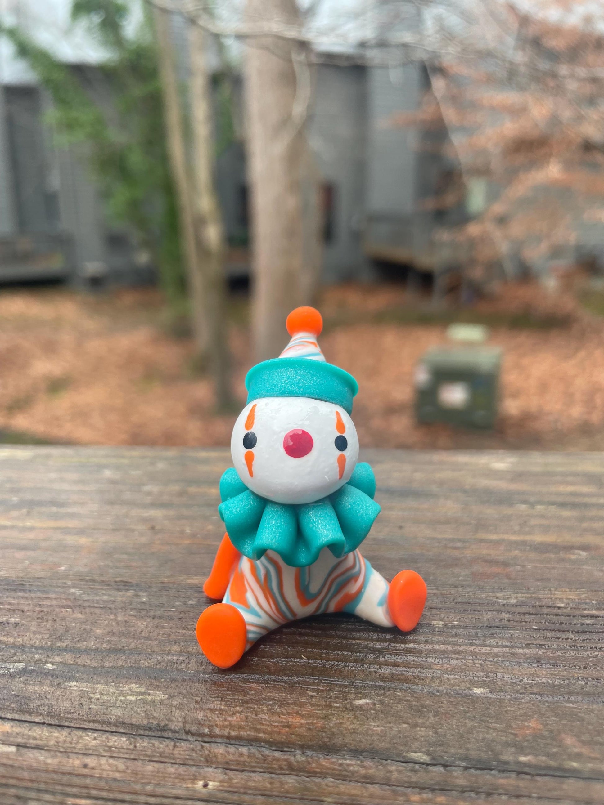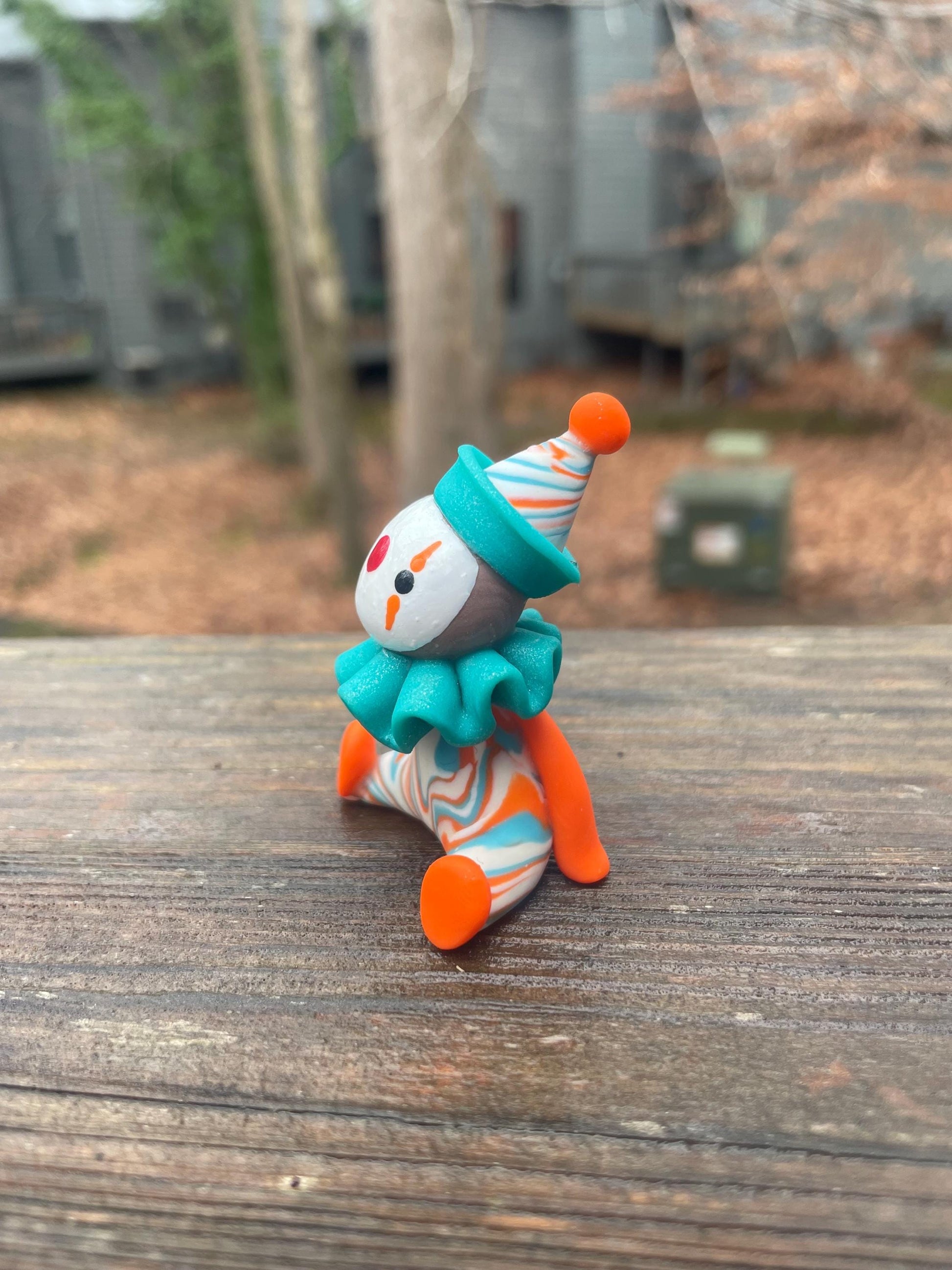 This is ZigZag! He is small clown figurine made from polymer clay. He has a white, orange, and sparkly teal color scheme with a marbled jumpsuit, a ruffle, and a pointed hat. He is about 2.5 inches tall and 1.5 inches wide and looking for a home! ZigZag's face is sealed with glaze to help retain his hand painted details.